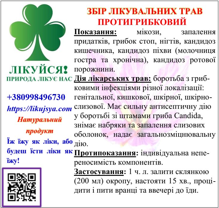 Використання такого збору може допомогти очистити організм від токсинів, зміцнити імунітет, поліпшити роботу печінки та нирок. Крім того, він може зняти запалення, полегшити симптоми алергії і покращити загальний стан шкіри. Тож, оберіть протигрибковий збір трав для підтримки свого здоров’я і боротьби з грибками, а переваги природної лікарської сили незабаром проявляться у вашому здоров’ї та самопочутті. Надайте своєму організму довгоочікуваний відпочинок та підтримку, та відчуйте благотворний вплив природи на своє здоров’я і життя.